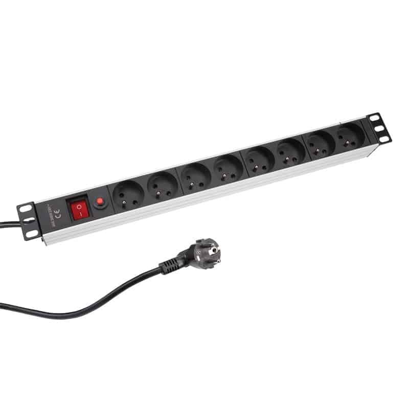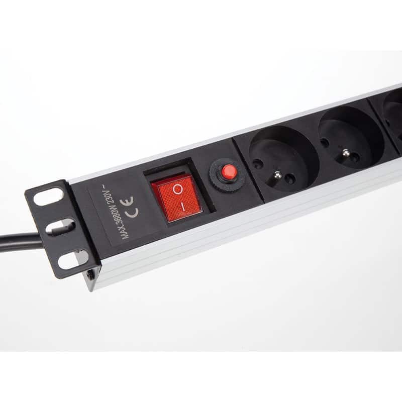 Bloc multiprise 8 prises type E avec terre française. Format compatible rack 19 pouces. Dimensions : 48 x 4,5 x 4,5 cm. Poids : 750 g. Couleur principale noire avec finitions gris et métal. Câble d’alimentation H05VV-F 3G1.5 de 2,15 m avec section de 1,5 mm². Tension nominale 230 V AC. Intensité nominale 16 A. Puissance maximale 3680 W. Protection contre les surtensions et les surcharges avec fusible intégré. Interrupteur marche/arrêt avec voyant lumineux. Indice de protection IP20. Utilisation en intérieur uniquement. Compatible prises type E/F (France/Allemagne).