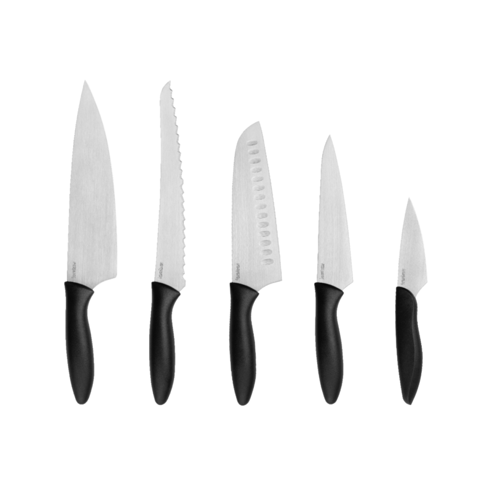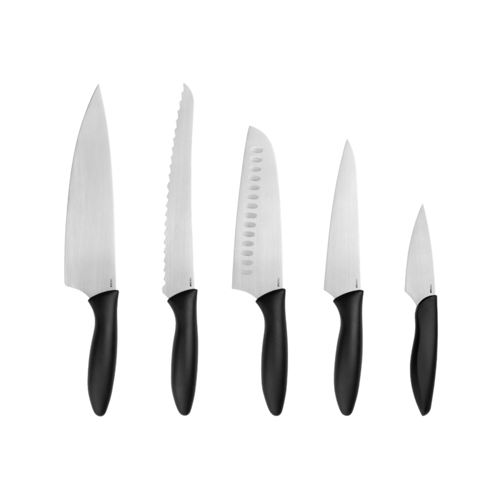 8-in. Chef’s Knife , 8-in. Bread Knife , 6.5-in. Santoku , 6-in. Utility Knife , 3.5-in. Paring Knife