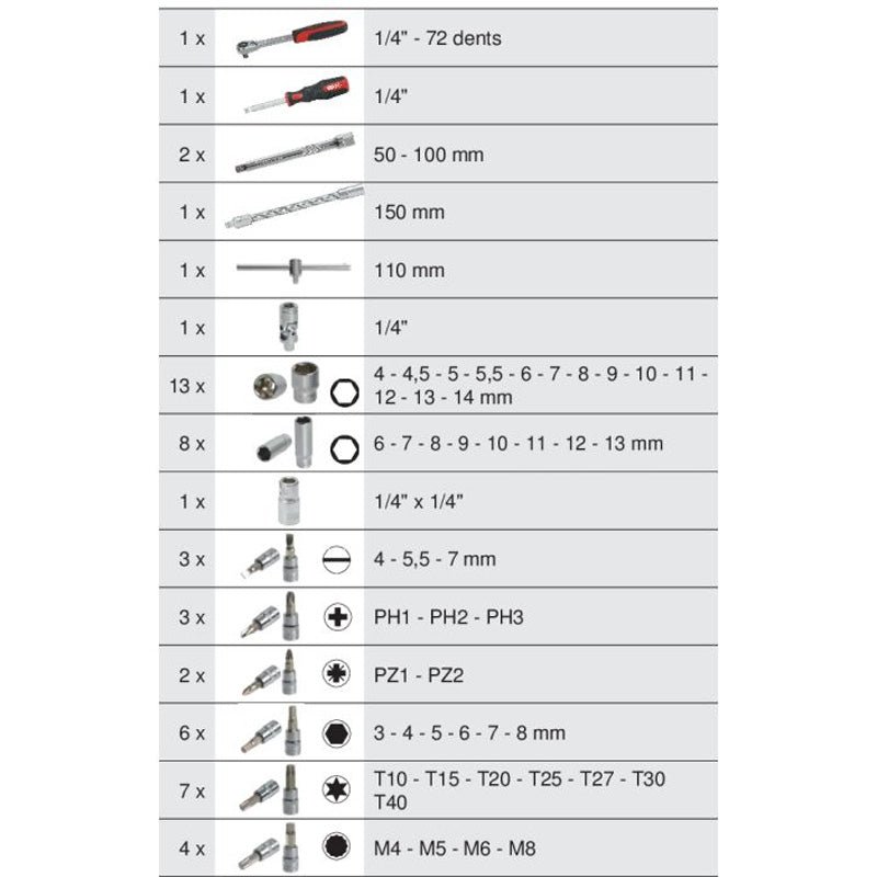 Caractéristiques techniques Module de douilles et accessoires ULTIMATE 1/4”, 54 pièces – KS TOOLS – 713.1020