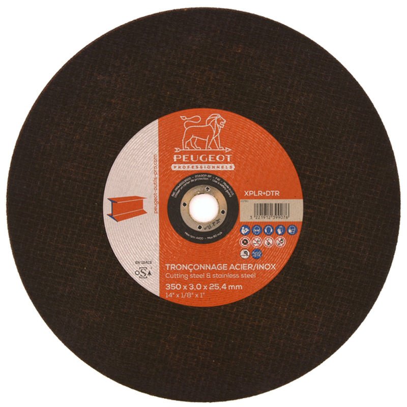 Modèle : PTMR350. Marque : PEUGEOT Outils Pro. Alimentation : 230 V monophasé. Puissance moteur : 2,2 kW. Vitesse de rotation : 3400 tr/min. Dimensions : 270 x 520 x 640 mm. Poids : 20 kg. Diamètre de disque : Ø350 mm (épaisseur 3 mm, alésage Ø25,4 mm). Machine transportable pour usage atelier ou chantier. Carter de protection de lame en acier épais avec fermeture automatique. Étau à manivelle avec serrage rapide et mors prismatique. Interrupteur homme-mort. Blocage rapide en position transport. Évacuation de chaleur via bac à copeaux. Protection anti-projection d’étincelles.