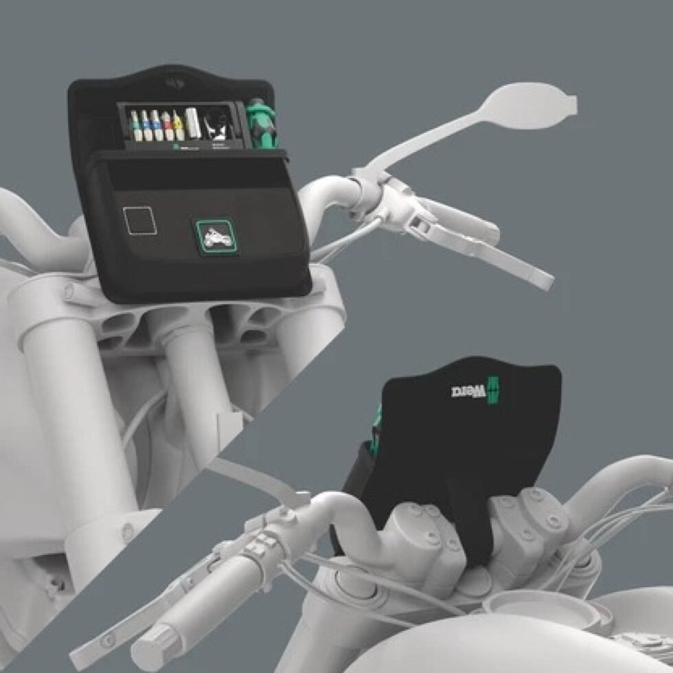 The set can be hung on the motorcycle frame via the flexible hook and loop part on the back