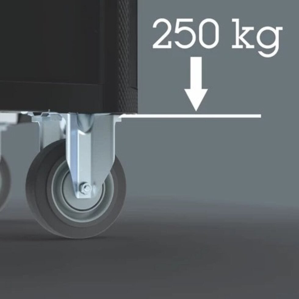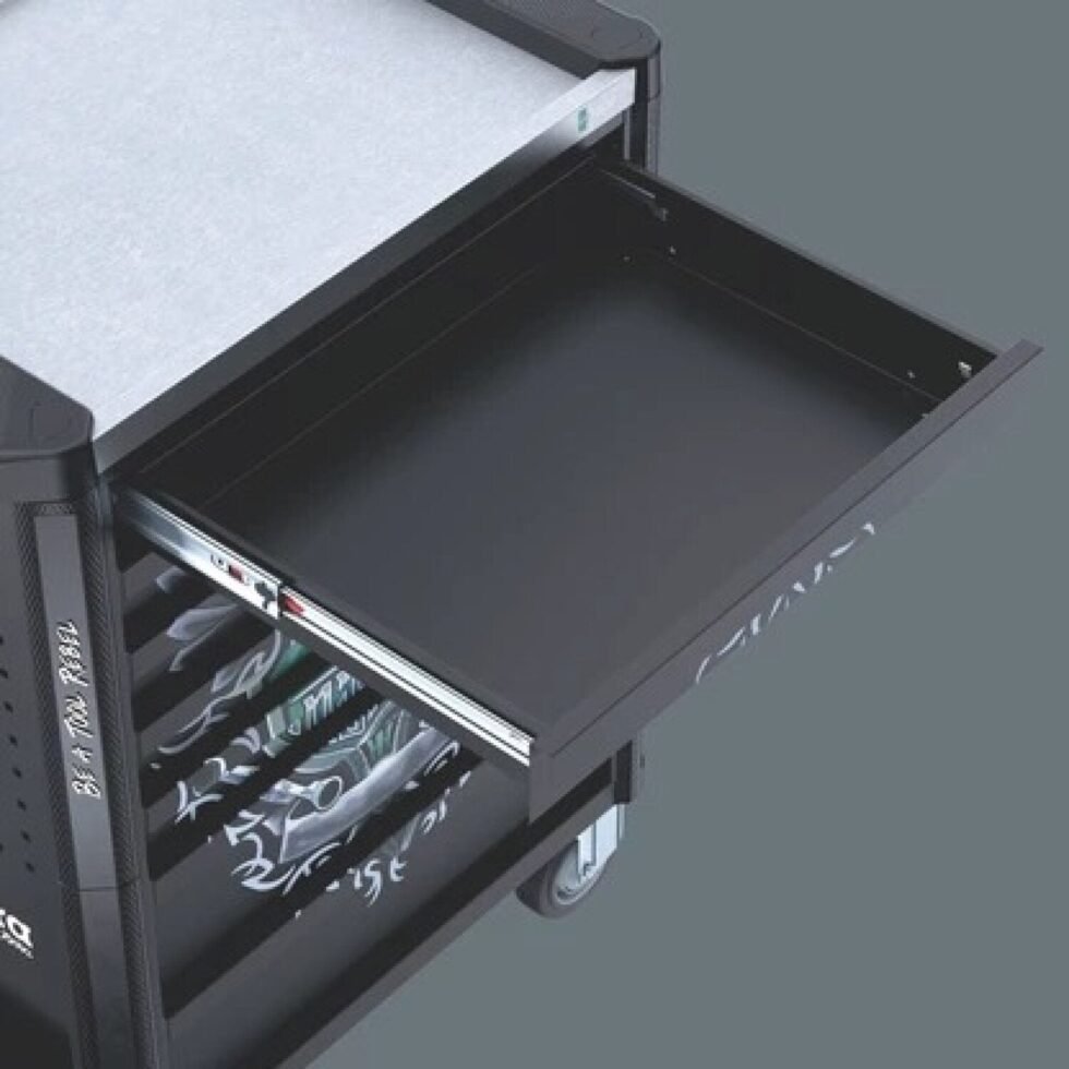 7 drawers (5 flat, 2 high) – of which 2 flat drawers are equipped with foam inserts and tools (e.g. with Zyklop Speed ratchets and accessories (1/4″ and 1/2″), Joker ratcheting combination wrenches and combination wrenches, Kraftform screwdrivers, L-keys, Kraftform Kompakt 60 and Tool-Check PLUS)